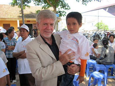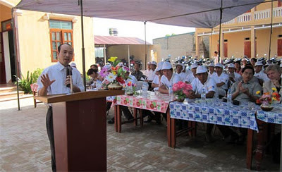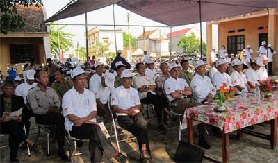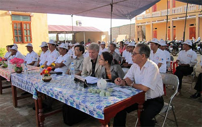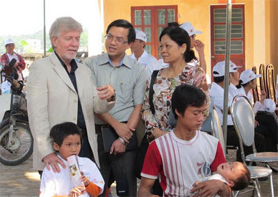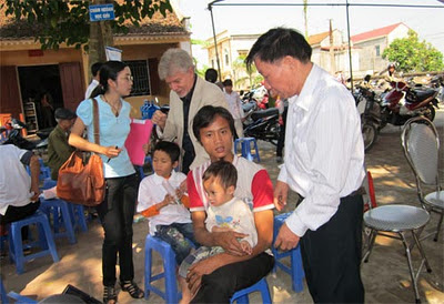 Ông Nguyễn Lũy, ông ManLio,bá Nguyễn Thị Bắc điều phối viên dự án thăm hỏi các gia đình và các cháu khuyết tất trong giờ vui chơi.