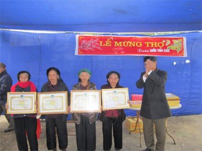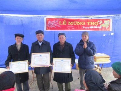 Đã thành nền nếp hàng năm, sáng mùng 4 tết, các cụ làng Thường Thượng (xã Thường Thắng) tổ chức lễ mừng thọ các cụ ông, cụ bà có tuổi 70, 75, 80, 85, 90, 95, 100. Với thế hệ trẻ thì thời tiết mấy ngày tết thật là đẹp. Trời tuy rét nhưng không mưa. Đi chơi tết tha hồ mặc đẹp. Nhưng với các cụ cao tuổi, trời rét quả là ngại ngùng, chẳng muốn ra khỏi nhà. Do đó mà lễ mừng thọ nặm nay các cụ cao tuổi vắng nhiều. Tuổi 85 có 6 cụ thì vắng 4. Tuôit 80 có 7 cụ thì vắng 3. Tuổi 75 có 6 cụ, vắng 3. Tuổi 70 có 10 cụ, cũng vắng 2 cụ. Làng năm nay chỉ có 4 độ tuổi được mừng thọ. Không có các cụ ở tuổi 90, 95, 100. Năm nay có cái mới là các cụ được mừng thọ đều có quà của UBND tỉnh. Tuổi 70, 75 có quà 100.000đ; tuổi 80, 85 có quà 200.000đ; tuổi 90,95 có quà 400.000đ; tuổi 100 có quà 500.000đ. Hội làng có quà cho các cụ tuổi 70, 80 là 1kg đường và 1 hộp bánh; tuổi 75, 85 thì có một hộp bánh. Trước khi vào lê mừng thọ là chương trình văn nghệ, đọc thơ, ngâm thơ mừng thọ, mừng xuân do các cụ tự sáng tác và trình bày.