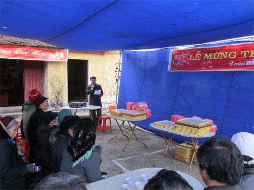 Đã thành nền nếp hàng năm, sáng mùng 4 tết, các cụ làng Thường Thượng (xã Thường Thắng) tổ chức lễ mừng thọ các cụ ông, cụ bà có tuổi 70, 75, 80, 85, 90, 95, 100. Với thế hệ trẻ thì thời tiết mấy ngày tết thật là đẹp. Trời tuy rét nhưng không mưa. Đi chơi tết tha hồ mặc đẹp. Nhưng với các cụ cao tuổi, trời rét quả là ngại ngùng, chẳng muốn ra khỏi nhà. Do đó mà lễ mừng thọ nặm nay các cụ cao tuổi vắng nhiều. Tuổi 85 có 6 cụ thì vắng 4. Tuôit 80 có 7 cụ thì vắng 3. Tuổi 75 có 6 cụ, vắng 3. Tuổi 70 có 10 cụ, cũng vắng 2 cụ. Làng năm nay chỉ có 4 độ tuổi được mừng thọ. Không có các cụ ở tuổi 90, 95, 100. Năm nay có cái mới là các cụ được mừng thọ đều có quà của UBND tỉnh. Tuổi 70, 75 có quà 100.000đ; tuổi 80, 85 có quà 200.000đ; tuổi 90,95 có quà 400.000đ; tuổi 100 có quà 500.000đ. Hội làng có quà cho các cụ tuổi 70, 80 là 1kg đường và 1 hộp bánh; tuổi 75, 85 thì có một hộp bánh. Trước khi vào lê mừng thọ là chương trình văn nghệ, đọc thơ, ngâm thơ mừng thọ, mừng xuân do các cụ tự sáng tác và trình bày.