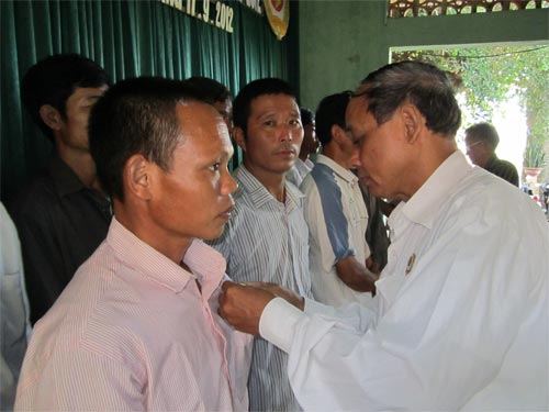 Chủ tịch Hội CCB huyện Hiệp Hòa Nguyễn Văn Minh gắn Huy hiệu CCB cho hội viên mới