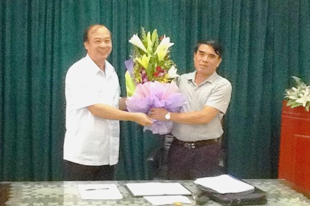 Ông Nguyễn Văn Minh, bên phải, nhận hoa chúc mừng.