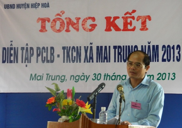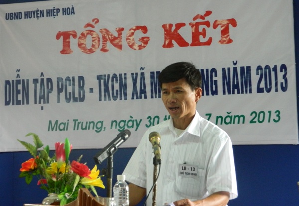 Phát biểu tổng kết buổi diễn tập, đồng chí Nguyễn Hữu Chính, phó chủ tịch UBND huyện, trưởng BCHPCLB huyện đã đánh giá cao sự cố gắng nỗ lực của cơ quan quân sự huyện và cấp ủy, chính quyền, các ban ngành, đoàn thể và nhân dân thôn Trung Hưng, xã Mai Trung trong việc chuẩn bị các điều kiện cần thiết tham gia diễn tập. Các lực lượng tham gia diễn tập từ xã đến thôn đã thể hiện tốt các nội dung và nhiệm vụ mà cuộc diễn tập đặt ra. Tuy nhiên, để chủ động đối phó với các tình huống lụt bão xảy ra trên địa bàn, đ/c cũng đề nghị Ban chỉ huy phòng chống lụt bão xã Mai Trung cần vận hành tốt cơ chế Đảng lãnh đạo, chính quyền điều hành, các ban ngành làm tham mưu, quán triệt phương châm “4 tại chỗ”, trong đó lấy lực lượng vũ trang địa phương làm nòng cốt trong công tác phòng chống lụt bão – tìm kiếm cứu nạn.