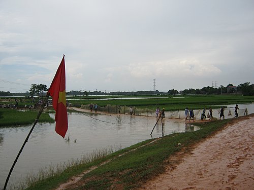 Nước đầm Để vẫn tiếp tục dâng cao do thượng nguồn dồn về mạnh. Chính vì vậy, con đê bối bao bọc cánh đồng của thôn Chúng và thôn Chằm từ cống Lò đến bãi sỏi khoảng gần 2 km luôn bị cảnh báo nguy hiểm. Chiều nay, nước vẫn tiếp tục tràn vào đồng, kết hợp lúc 13h (10/8/2013), một cơn mưa rào nhẹ làm mặt đê nhầy nhụa nhưng cờ đỏ sao vàng bay phấp phới và trống thúc liên hồi trên đê đã giúp cho bà con nhân dân quên hết mệt mỏi mà càng thể hiện quyết tâm cao để chống chọi, đối phó với nước lũ, ngăn không cho nước tràn vào đồng để bảo vệ phần hoa màu còn lại và tài sản chung trong nhân dân.