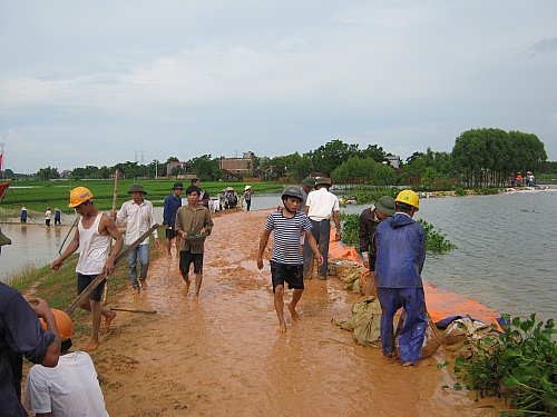 Hàng trăm bà con nhân dân vẫn tích cực khiêng đất đắp đê, ngăn nước.