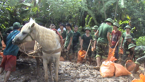 Bộ đội Lữ Đoàn pháo binh 675- trường Phòng không không quân giúp nhân dân đắp đê chống tràn