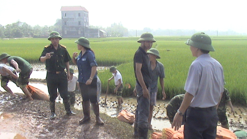Chủ tịch UBND huyện Nguyễn Thị Hoa có mặt tại hiện trường tham gia chống lụt cùng nhân dân và bội đội.