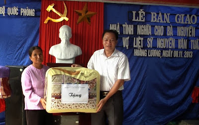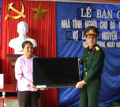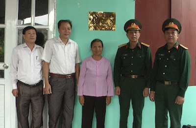 Các đồng chí lãnh đa Bộ CHQS tỉnh, UBNd huyện, Ban CHQS huyện, UBND xã Hoàng Lương bàn giao nhà tình nghĩa cho bà Lập