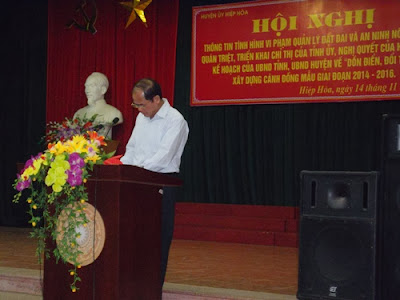 Sáng 14/11, BTV Huyện ủy Hiệp Hòa tổ chức hội nghị chuyên đề thông tin về tình hình vi phạm quản lý đất đai và an ninh nông thôn; quán triệt triển khai các chỉ thị, nghị quyết, kế hoạch của tỉnh, huyện về công tác “dồn điền đổi thửa” giai đoạn 2014 – 2016”