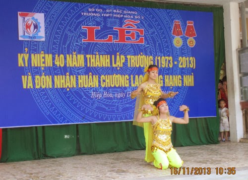 Từ sáng nay, 16-11, các hoạt động chào mừng kỷ niệm 40 năm ngày thành lập trường và đón nhận Huân chương lao động hạng Nhì của trường PTTH Hiệp Hòa 2 đã tưng bừng diễn ra. Sôi nổi và hấp dẫn nhất là phần thi văn nghệ- Thể dục thể thao của các khối lớp với những tiết mục đặc sắc, hào hứng. Bên cạnh đó nhà trường còn tổ chức các phần thi Hội chợ ẩm thực, hội chợ hàng tiêu dùng, quà lưu niệm với những ý nghĩa thiết thực. Các lớp học, hàng cây đều được trang trí rất đẹp. Đến với trường chúng ta sẽ có được những cảm nhận say sưa phấn khởi của một lễ hội tưng bừng. Tất cả đều náo nức, hân hoan.