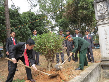 Ông Trần Quang Tấn, Chủ tịch UBND huyện; ông Trần Hoài Sơn, Sư đoàn trưởng, sư đoàn 325 cùng các đại biểu trồng cây trong ngày Hội.