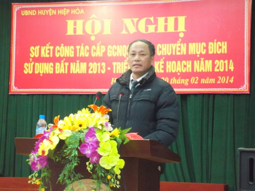 Sáng 20/2/2014, UBND huyện Hiệp Hòa tổ chức hội nghị sơ kết công tác cấp giấy CNQSD đất, chuyển mục đích sử dụng đất năm 2013, triển khai kế hoạch năm 2014. Dự hội nghị có đồng chí Bùi Quang Huy – phó giám đốc Sở tài nguyên môi trường; ở huyện có đồng chí Vũ Chí Kỳ – CT HĐND huyện; đồng chí Nguyễn Thị Hoa – CT UBND huyện; các đồng chí trong TTHU, HĐND, UBND huyện; lãnh đạo một số cơ quan chuyên môn của huyện; các đồng chí là chủ tịch UBND, cán bộ địa chính, tài chính 26 xã, thị trấn.