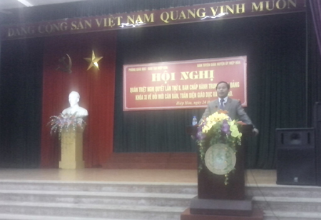 Chiều ngày 24/02/2014, được sự chỉ đạo của Huyện ủy Hiệp Hòa, Phòng GD&ĐT chủ trì, phối hợp với Ban Tuyên giáo Huyện ủy tổ chức Hội nghị quán triệt Nghị quyết Ban Chấp hành Trung ương lần thứ 8 khóa XI về Đổi mới căn bản, toàn diện giáo dục và đào tạo, đáp ứng yêu cầu công nghiệp hóa – hiện đại hóa trong điều kiện kinh tế thị trường định hướng xã hội chủ nghĩa và hội nhập quốc tế.