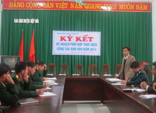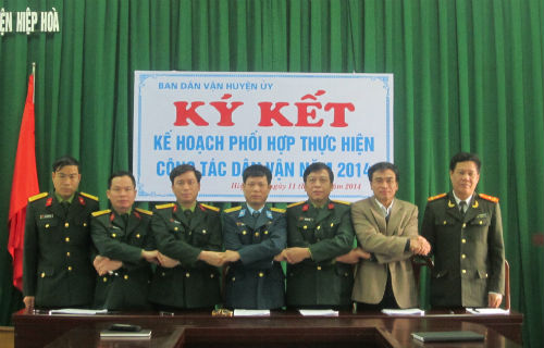 Sau phần tổng kết đánh giá kết quả 2013, Lãnh đạo Ban Dân vận Huyện ủy – Công an huyện – Ban Chỉ huy quân sự huyện và thủ trưởng các đơn vị Lữ đoàn 675 pháo binh; Phân hiệu 2 – Trường TCKT-PKKQ; Kho K23; Căn cứ hậu cần thuộc Bộ CHQS tỉnh: Trạm giam T79 đã tiến hành ký kết thực hiện kế phối hợp công tác dân vận năm 2014 trong không khí trang trọng.