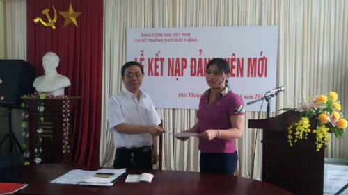 Chiều ngày 4/4, Chi bộ trường THCS Đức Thắng tổ chức kết nạp Đảng cho đồng chí Nguyễn Thị Hương, nâng tổng số đảng viên của chi bộ lên 30. Đồng chí Nguyễn Thị Hương là cô giáo dạy mỹ thuật, trưởng ban nữ công nhà trường. Trong quá trình phấn đấu vào Đảng, đồng chí Nguyễn Thị Hương có nhiều thành tích trong giảng dạy, nhiều năm là giáo viên dạy giỏi cấp huyện, có nhiều học sinh đạt giải trong các kỳ thi vẽ cấp tỉnh và cấp huyện.