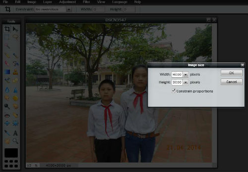 5- Để nén ảnh, bạn trỏ chuột vào chữ Image trên thanh công cụ, xuất hiện một thư mục, kích chuột vào dòng thứ nhất của thư mục, xuất hiện kích thước của ảnh, dòng trên là chiều ngang, dòng dưới là chiều cao của ảnh. Bạn chỉ cần chỉnh sửa kích thước chiều ngang theo ý, bấm OK, rồi lưu là OK.
