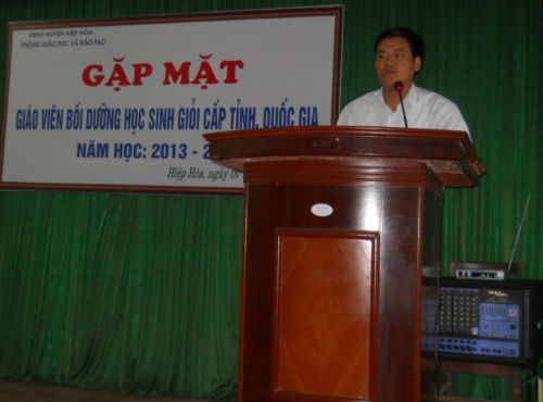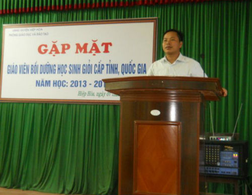 Tại buổi gặp mặt, đồng chí Mai Sơn- Tỉnh ủy viên- Bí thư Huyện ủy Hiệp Hòa đã phát biểu biểu dương, ghi nhận thành tích mà các thầy cô giáo bồi dưỡng HSG đã đạt được. Để phát huy tốt truyền thống cách mạng, hiếu học của huyện nhà, đồng chí yêu cầu Phòng GD& ĐT tiếp tục phát huy công tác bồi dưỡng để nâng cao chất lượng, số lượng HSG các năm tiếp theo.