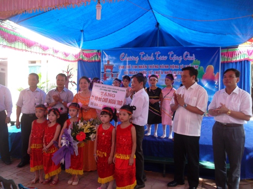Nhân dịp này, đồng chí Trần Sỹ Thanh – Bí thư Tỉnh ủy cùng các ông bà lãnh đạo Tỉnh ủy, HĐND, UBND Tỉnh, Sở LĐTBXH, Hội bảo trợ trẻ em tỉnh; đại diện lãnh đạo công ty TNHH Việt Thắng đã tặng hoa, trao quà bánh kẹo và tặng một bộ đồ chơi ngoài trời trị giá 50 triệu đồng cho các cô và trò trường Mầm non Lương Phong 2; thay mặt Huyện ủy, HĐND, UBND huyện đồng chí Mai Sơn – Bí thư huyện ủy Hiệp Hòa cùng các ông bà đại diện lãnh đạo Phòng lao động thương binh xã hội huyện; phòng giáo dục đào tạo huyện cũng trao quà và tặng thiết bị học tập là một chiếc tivi 32in trị giá 7 triệu đồng cho cô, trò của nhà trường; đại diện lãnh đạo ĐU, HĐND, UBND xã Lương Phong cũng trao quà bánh kẹo cho các cháu thiếu nhi trường Mầm non Lương Phong 2. Qua đó tạo điều kiện cho các cháu vượt qua khó khăn, vươn lên trong học tập.