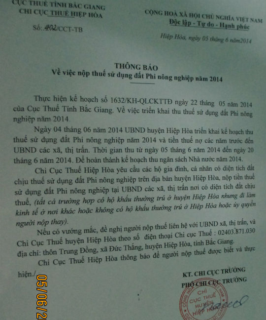 Chi cục thuế huyện Hiệp Hòa vừa có thông báo về việc nộp thuế sử dụng đất phi nông nghiệp năm 2014. Theo đó, Chi cục thuế huyện Hiệp Hòa yêu cầu tất cả các hộ gia đình, các cá nhân có diện tích đất chịu thế sử dụng đất phi nông nghiệp trên địa bàn huyện Hiệp Hòa, nộp thuế tại UBND các xã, thị trấn. Với các chủ đất đi làm xa, hoặc không có hộ khẩu thường trú tại huyện Hiệp Hòa thì ủy quyền cho người nộp thay.