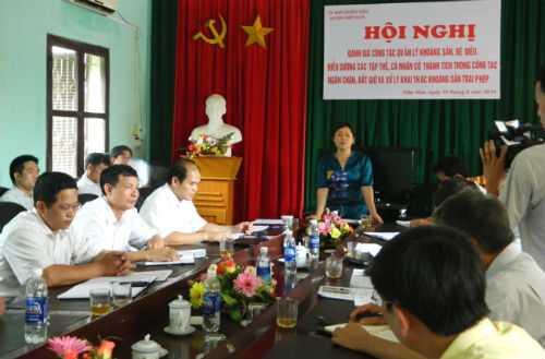 UBND huyện Hiệp Hòa vừa tổ chức hội nghị đánh giá công tác quản lý khoáng sản, đê điều; Biểu dương các tập thể, cá nhân có thành tích trong công tác ngăn chặn, bắt giữ và xử lý khai thác khoáng sản trái phép. Đến dự có lãnh đạo UBND huyện, lãnh đạo một số cơ quan, ban ngành liên quan, chủ tịch UBND các xã ven đê. Đồng chí Nguyễn Thị Hoa, chủ tịch UBND huyện chủ trì hội nghị.