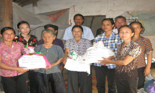 Chị Trần Thị Soan – người đứng đầu hàng trên bên phải, tặng gạo tiết kiệm từ mô hình “Hũ gạo tiết kiệm” cho gia đình bà Thi, bà Ngọt, bà Tỳ là những hộ nghèo, có hoàn cảnh khó khăn của thôn.