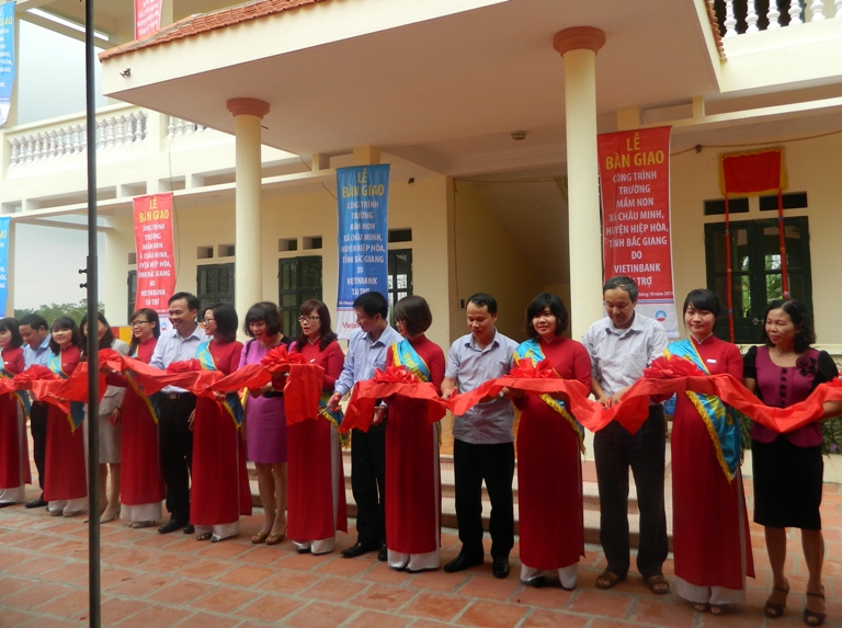 Sáng 31/10, Ngân hàng Thương mại cổ phần Công thương Việt Nam (ViettinBanhk) đã phối hợp với UBND tỉnh Bắc Giang tổ chức bàn giao trường mầm non xã Châu Minh cho chính quyền cơ sở để đưa vào sử dụng. Đồng chí Bùi Văn Hạnh, phó CT UBND tỉnh đã đến dự. Cùng dự có đại diện lãnh đạo Đảng ủy khối doanh nghiệp tỉnh, Sở giáo dục và đào tạo tỉnh; Ngân hàng nhà nước tỉnh; Ngân hàng công thương Việt Nam, Chi nhánh bắc Giang, Chi nhánh Gia Lai. Đồng chí Mai Sơn, Bí thư HU Hiệp Hòa; đồng chí Tạ Việt Hùng, phó CT UBND huyện và đại diện Đang ủy, HĐND, UBND, các ban ngành, đoàn thể, cán bộ, giáo viên trường mầm non xã Châu Minh cũng đã đến dự lễ bàn giao.