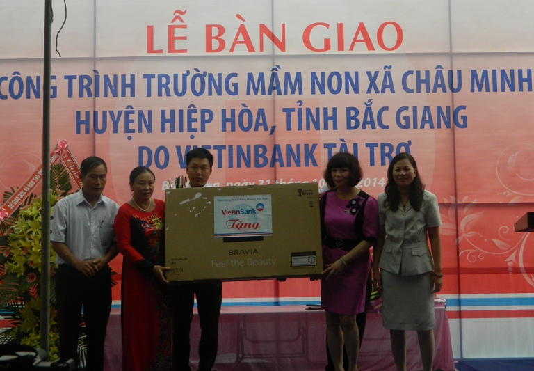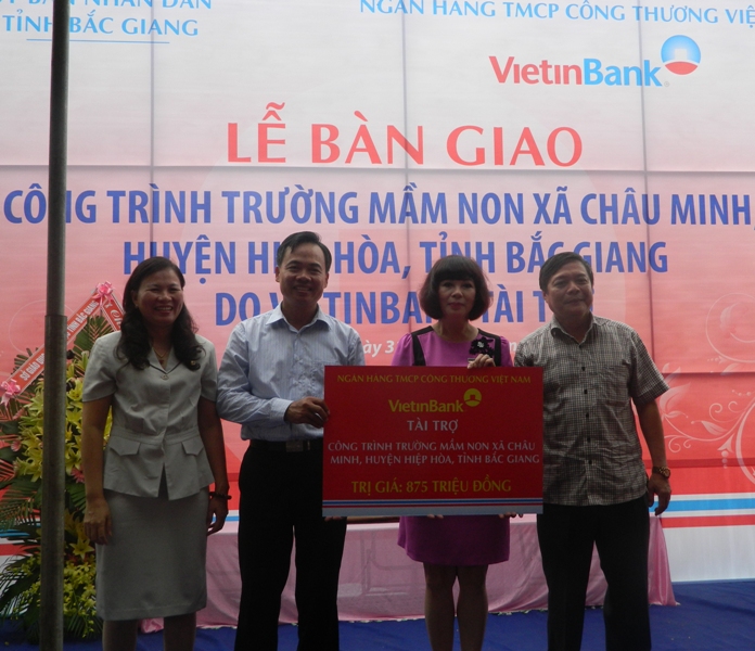 Công trình gồm 4 phòng học kiên cố, với tổng mức đầu tư hơn 1,75 tỷ đồng, trong đó Viettinbank Việt Nam tài trợ hơn 800 triệu đồng; UBND huyện Hiệp Hòa hỗ trợ 400 triệu đồng, còn lại là ngân sách địa phương. Công trình khởi công từ tháng 12 năm 2013 và hoàn thành, đưa vào sử dụng đúng tiến độ, khắc phục tình trạng học tạm, học nhờ cho học sinh bậc học mầm non của xã Châu Minh. Tại buổi lễ, đại diện ViettinBank đã bàn giao số tiền tài trợ hơn 800 triệu đồng và trao tặng nhà trường một số đồ dùng học tập, vui chơi cho trẻ, phục vụ trực tiếp việc học tập, giảng dạy của thầy và trò tại đây, với tổng trị giá 75 triệu đồng. Tại đây, bà Nguyễn Thị Thanh Xuân, phó chủ tịch thường trực Công đoàn ViettinBank đã chia sẻ: Đây là việc làm thể hiện tình cảm, trách nhiệm của tập thể cán bộ, nhân viên ViettinBank đối với sự phát triển của cộng đồng, xã hội. Việc làm đó góp phần nâng cao cơ sở vật chất cho ngành giáo dục của tỉnh, trong đó có ngành giáo dục ở xã Châu Minh còn gặp nhiều khó khăn và thiết thực chăm sóc những mầm non của đất nước.