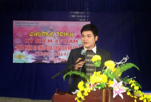 Sau lễ chào cờ, thầy giáo Ngô Xuân Cường, TPT Đội đã khái quát nội dung, ý nghĩa và quá trình công bố cũng như thực hiện Di chúc của Bác Hồ. Thầy nêu rõ : Di chúc của Người là một văn kiện lịch sử vô cùng quý giá, thể hiện những tâm nguyện thiết tha của Bác trước lúc đi xa. 45 năm qua, toàn Đảng, toàn quân, toàn dân ta đã và đang phấn đấu thực hiện theo Di chúc của Người.
