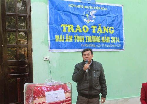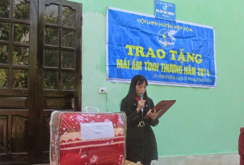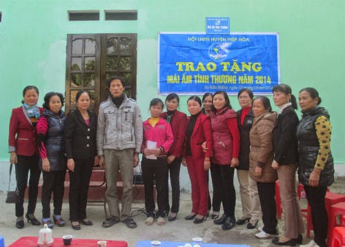 Thực hiện chương trình công tác năm 2014, chiều nay- 17-12-2014, Hội LHPN Hiệp Hòa cùng HLHPN Thị trấn Thắng đã tổ chức Lễ trao tặng nhà ” Mái ấm tình thương” cho gia đình chị Khương Thị Trang, hội viên chi hội phụ nữ Khu 4- Thị trấn Thắng.Đó là một ngôi nhà cấp 4, diện tích hơn 70 m2 với kinh phí xây dựng là 105 triệu đồng, lấy từ nhiều nguồn hỗ trợ khác nhau. Trong đó , riêng Hội LHPN huyện đã ủng hộ 20 triệu đồng.