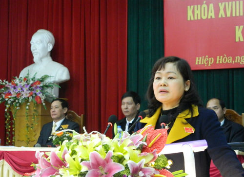 Tiếp đó, Chủ tịch UBND huyện Nguyễn Thị Hoa đã phát biểu khẳng định những kết quả nổi bật trong phát triển kinh tế- xã hội năm 2014, đồng thời thể hiện quyết tâm cao trong thực hiện các mục tiêu, nhiệm vụ năm 2015. Chủ tịch UBND huyện cũng đã nêu, chỉ rõ những vấn đề cử tri quan tâm, bức xúc, những vấn đề còn tồn tại, hạn chế trong công tác chỉ đạo điều hành của UBND huyện. Năm 2015, UBND huyện đề ra những mục tiêu, nhiệm vụ, giải pháp trong chỉ đạo điều hành phát triển kinh tế – xã hội. Trong đó tiếp tục đẩy mạnh phát triển sản xuất, kinh doanh; nâng cao chất lượng tăng trưởng; đẩy mạnh chuyển dịch cơ cấu kinh tế theo hướng công nghiệp- dịch vụ- nông nghiệp; phát triển toàn diện các lĩnh vực văn hóa- xã hội; bảo đảm an sinh và phúc lợi xã hội, cải thiện đời sống nhân dân; giữ vững ổn định chính trị, tăng cường củng cố quốc phòng, bảo đảm an ninh, trật tự, an toàn xã hội; Đẩy mạnh cải cách hành chính, phấn đấu hoàn thành và hoàn thành vượt các chỉ tiêu phát triển kinh tế- xã hội năm 2015, góp phần thực hiện thắng lợi Nghị quyết Đại hội Đảng bộ huyện lần thứ XXII và kế hoạch phát triển kinh tế- xã hội 5 năm 2011- 2015.