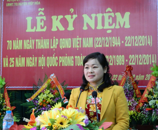 Chủ tịch UBND huyện Nguyễn Thị Hoa đọc diễn văn chào mừng ngày thành lập QĐND VN