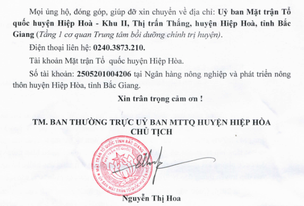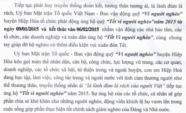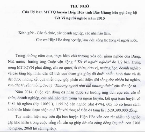 Tiếp tục phát huy truyền thống đoàn kết, tương thân tương ái, lá lành đùm lá rách, Uỷ ban Mặt trận Tổ quốc Việt Nam – Ban vận động quỹ “Vì người nghèo” huyện Hiệp Hòa tổ chức phát động ủng hộ quỹ “Tết vì người nghèo”năm 2015 từ ngày 09/01/2015 và kết thúc vào 06/02/2015 nhằm vận động các nhà hảo tâm, các tổ chức, các doanh nghiệp và toàn dân ủng hộ “Tết Vì người nghèo”, cùng chung tay giúp đỡ hộ nghèo có thêm điều kiện vui xuân đón Tết. Toàn văn thư ngỏ: