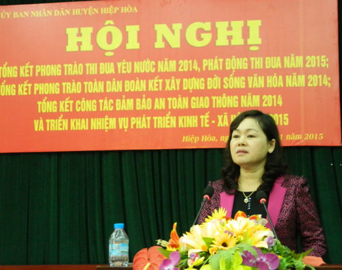Đến dự có đồng chí Bùi Ngọc Sơn, Giám đốc Sở nội vụ, phó CT Hội đồng thi đua khen thưởng tỉnh; đồng chí Mai Sơn, Bí thư huyện ủy Hiệp Hòa; đồng chí Vũ Chí Kỳ, phó BTTT huyện ủy, CT HĐND huyện; Cùng các đồng chí thường trực huyện ủy- HĐND, các phó CT UBND huyện, các Ban xây dựng đảng, thành viên BCĐ phong trào TDĐKXDĐSVH huyện, Ban ATGT huyện, trưởng các ban ngành đoàn thể; thủ trưởng các cơ quan, đơn vị trực thuộc UBND huyện; Thủ trưởng các cơ quan Trung ương, tỉnh đóng trên địa bàn; Bí thư đảng ủy, Chủ tịch HĐND, UBND, trưởng công an, công chức văn hóa xã hội các xã, thị trấn; đại diện các thôn được công nhận danh hiệu văn hóa lần đầu, các gia đình tiêu biểu trong việc hiến ặng hiện vật trưng bày tại nhà truyền thống ATK, các tập thể, cá nhân được CT UBND huyện khen thưởng trong phong trào thi đua yêu nước, công tác đảm bảo ATGT năm 2014. Đồng chí Nguyễn Thị Hoa, CT UBND huyện, chủ trì hội nghị.