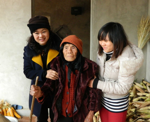 Chủ tịch UBND huyện Nguyễn Thị Hoa hỏi thăm sức khỏe mẹ VNAH Chu Thị Tẽo