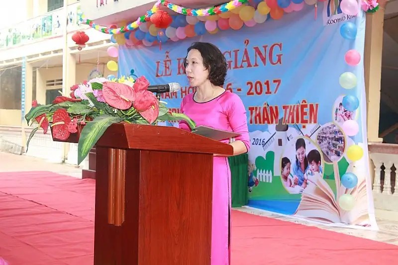 Đồng chí Hoàng Thị Lệ – Hiệu trưởng trường TH Hoàng Lương đọc diễn văn lễ khai giảng và khai trương thư viện