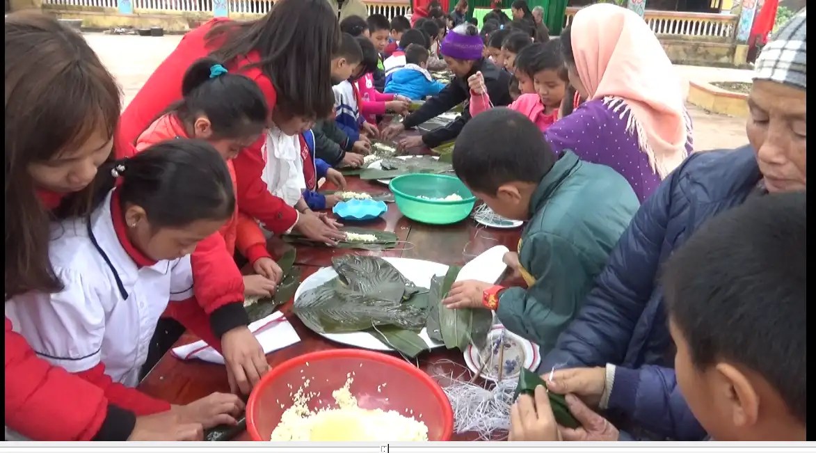 Chương trình “ Ngày tết quê em” là hoạt động thường niên của học sinh nhà trường để các em được thực hiện một số công việc đơn giản và hiểu được ý nghĩa Tết truyền thống của dân tộc. Nhằm giúp các em làm tốt một số công việc trong gia đình để chuẩn bị Tết Nguyên Đán, khối lớp 4 tổ chức chương trình thi gói bánh tro. Bánh tro hay một số nơi còn gọi là bánh gio. Nguyên liệu của bánh tro rất đơn giản được lấy từ sản phẩm của chính quê hương các em. Gạo nếp, nước tro và lá dong hay lá chít là những nguyên liệu để gói bánh. Tại buổi thực hành, học sinh được phụ huynh học sinh giới thiệu cụ thể về nước tro làm vị để ngâm gạo nếp. Theo đó, nước tro được đốt từ những nguyên liệu sẵn có tại địa phương như cây gai, cây mỏ, vỏ lạc, vỏ đỗ, quả xoan…. . Sau khi đốt, tro này được đem hòa với nước vôi theo một tỷ lệ nhất định để cho ra cái bánh có màu hổ phách, phảng phất hương vôi lẫn với mùi hương của cây quả, ngòn ngọt thơm mát. Đó chính là hương vị đặc biệt của loại bánh tro. Trong số các loại bánh ngày tết, bánh tro cũng được nhiều gia đình gói và thưởng thức loại bánh này.