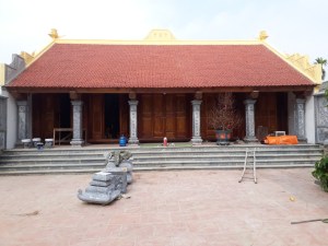 Toà Tam bảo 140m2 được làm bằng gỗ lim, tường xây bằng gạch cổ, chân cột đứng trên tảng đá, sáu cột hiên, năm bậc thềm đá liền khối, 2 cột đồng trụ đá góp phần làm ngôi chùa uy nghi cổ kính do các nghệ nhân đá Ninh Bình cung cấp.
