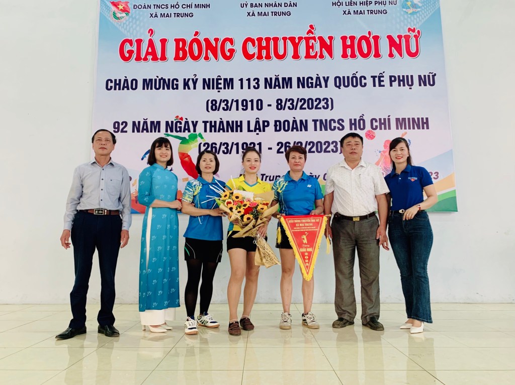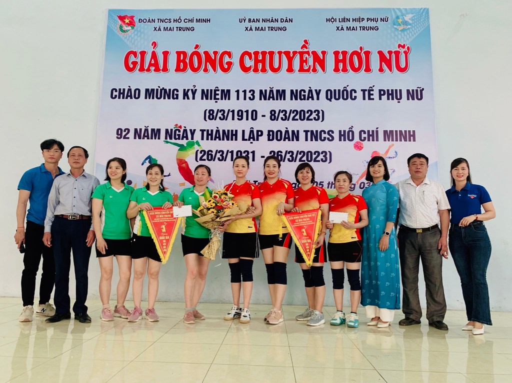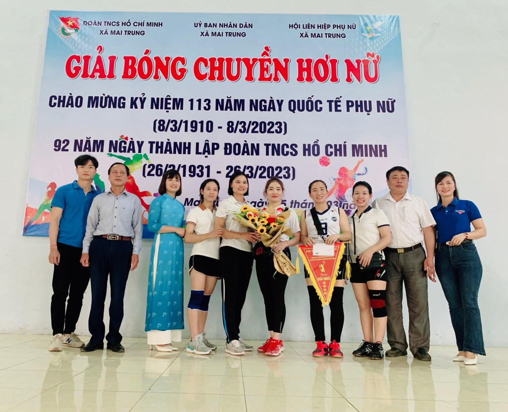 Ngày 5/3, Hội LHPN – Đoàn TNCS Hồ Chí Minh xã Mai Trung phối hợp với UBND xã tổ chức giải giao hữu bóng chuyền hơi nữ nhằm thiết thực lập thành tích chào mừng kỷ niệm 113 năm Ngày Quốc tế Phụ nữ (8/3/1910 – 8/3/2023) và 1984 năm khởi nghĩa Hai Bà Trưng; Chào mừng 92 năm Ngày thành lập Đoàn Thanh niên Cộng sản Hồ Chí Minh (26/3/1931-26/3/2023) và chào mừng xã Mai Trung đạt chuẩn Nông thôn mới Nâng Cao năm 2022. Dự khai mạc có các đồng chí lãnh đạo Đảng ủy, TT HĐND, lãnh đạo UBND, TT MTTQ xã cùng đông đảo cán bộ, hội viên, đoàn viên và nhân dân.
