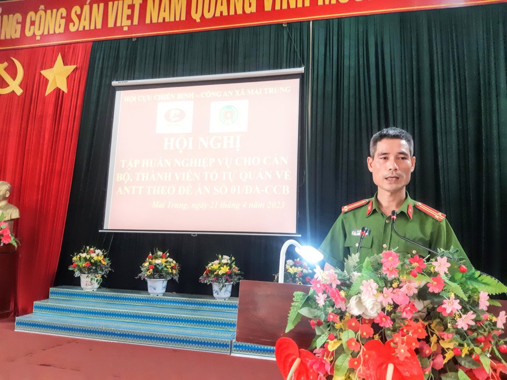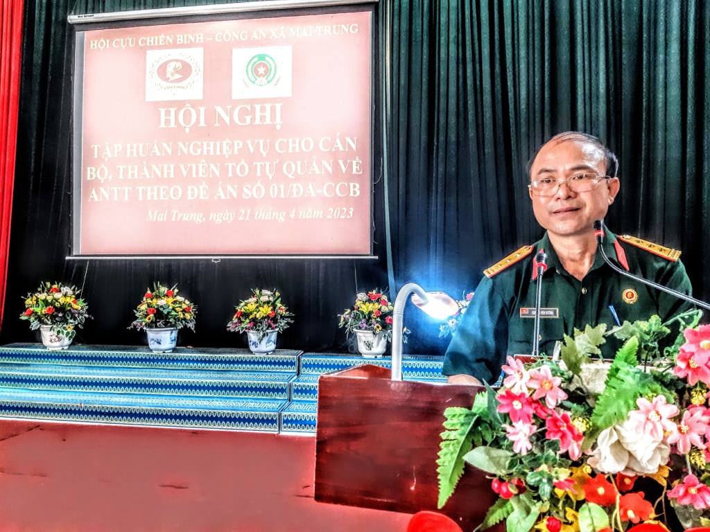 Thực hiện Đề án số 01/ĐA-CCB ngày 20/12/2021 của Hội Cựu chiến binh tỉnh về “Nâng cao vai trò, trách nhiệm của hội viên Hội CCB tỉnh Bắc Giang trong hoạt động tự quản bảo đảm ANTT từ cơ sở giai đoạn 2022-2025”. Ngày 21/4/2023, Công an xã phối hợp với Hội CCB xã Mai Trung tổ chức Hội nghị tập huấn bồi dưỡng nghiệp vụ cho cán bộ Hội CCB cơ sở và 49 thành viên tổ tự quản về ANTT thôn với thời gian 01 ngày , địa điểm tại Hội trường xã Mai Trung. Công tác tập huấn đã được tổ chức chặt chẽ, nghiêm túc; cán bộ tham gia Hội nghị tập huấn đúng đối tượng, thành phần, bảo đảm số lượng, đã nêu cao tinh thần trách nhiệm, tổ chức có hiệu quả các nội dung, chương trình đề ra, bám sát tình hình thực tiễn; Hội nghị đã bồi dưỡng 4 nội dung chuyên đề cơ bản trong đó tập trung 2 vấn đề trọng tâm đó là: Công tác phòng ngừa trộm cắp tài sản, tội phạm sử dụng công nghệ cao và chuyên đề Hướng dẫn kích hoạt tài khoản định danh điện tử, tạo tài khoản trên dịch vụ công; phối hợp lực lượng công an quản lý địa bàn, vận động các hộ kinh doanh nhà trọ đăng ký kinh doanh.