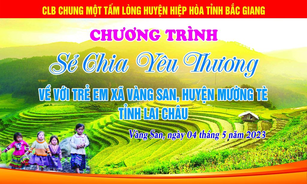 Thực hiện kế hoạch công tác năm 2023, căn cứ vào nhu cầu thực tế của các nhà trường, CLB Chung một tấm lòng huyện Hiệp Hoà đã mở cuộc vận động từ thiện “ Sẻ chia Yêu thương- Về với trẻ em xã Vàng San huyện Mường Tè tỉnh Lai Châu” Chương trình chính thức được phát động trên trang Facebook của CLB từ ngày 28/3/2023.