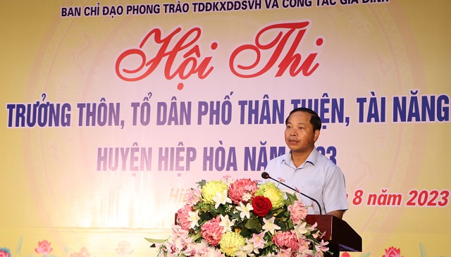 Ngày 02/8, Ban chỉ đạo Phong trào toàn dân đoàn kết xây dựng đời sống văn hóa và công tác gia đình huyện Hiệp Hòa đã tổ chức hội thi “Trưởng thôn, tổ dân phố thân thiện, tài năng” huyện Hiệp Hòa năm 2023. Tới dự có các đồng chí Phạm Văn Nghị, Phó Chủ tịch UBND, Trưởng BCĐ phong trào TDĐKXDĐSVH và công tác gia đình huyện. Đây là lần đầu tiên huyện Hiệp Hòa tổ chức hội thi này.