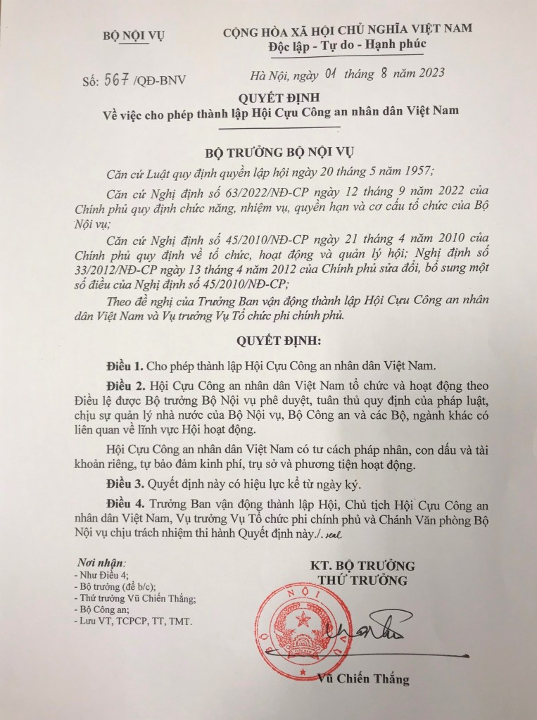 Ngày 01/8/2023 Bộ trưởng Bộ Nội vụ đã ban hành Quyết định về việc cho phép thành lập Hội cựu Công an nhân dân Việt Nam.