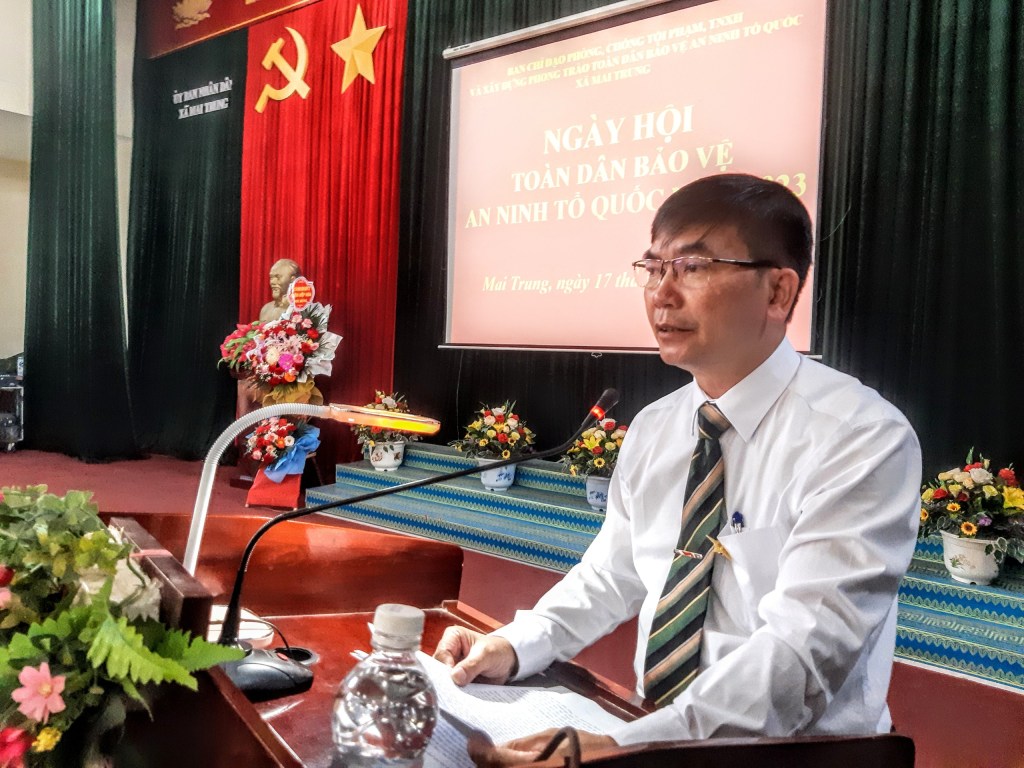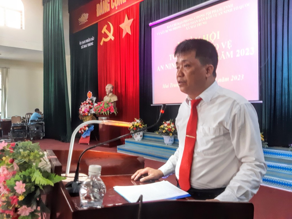 Phát biểu chỉ đạo, đồng chí Phạm Văn Nghị- Phó Chủ tịch UBND huyện, phó trưởng Ban chỉ đạo phòng chống tội phạm, tệ nạn xã hội và xây dựng phong trào toàn dân bảo vệ an ninh tổ quốc huyện ghi nhận, đánh giá cao kết quả mà các xã Mai Trung đã nỗ lực thực hiện thời gian qua. Để phong trào tiếp tục đạt kết quả cao, Phó chủ tịch UBND huyện cũng yêu cầu lãnh đạo xã Mai Trung cần quan tâm thực hiện một số nội dung: Tiếp tục rà soát địa bàn, đánh giá tình hình an ninh trật tự, tăng cường công tác quản lý địa bàn phát động phong trào bảo vệ an ninh tổ quốc; tổ chức phòng ngừa không để địa bàn phức tạp về an ninh trật tự. Đẩy mạnh công tác phát động phong trào toàn dân bảo vệ an ninh tổ quốc, đổi mới nội dung, hình thức, biện pháp công tác tuyên truyền, phổ biến, giáo dục pháp luật; duy trì củng cố kiện toàn và phát huy hiệu quả các mô hình đảm bảo an ninh trật tự tại khu dân cư. Chú trọng nhân rộng các mô hình, điển hình tiên tiến và nâng cao chất lượng các hình thức tự quản, tự phòng, tự bảo vệ, tự hòa giải từ gia đình đến cộng đồng dân cư, các cơ quan, doanh nghiệp, nhà trường. Thường xuyên tổ chức sơ kết, tổng kết rút kinh nghiệm; có kế hoạch tổ chức rà soát, phân loại chất lượng các mô hình tổ chức quần chúng bảo vệ an ninh, trật tự, nhân rộng kinh nghiệm mô hình hoạt động hiệu quả, chọn lựa xây dựng những mô hình mới phù hợp. Làm tốt công tác thi đua, khen thưởng, kịp thời phát hiện, biểu dương, khen thưởng, tôn vinh các mô hình, điển hình tiên tiến lập thành tích đóng góp tích cực trong xây dựng phong trào ở địa phương.