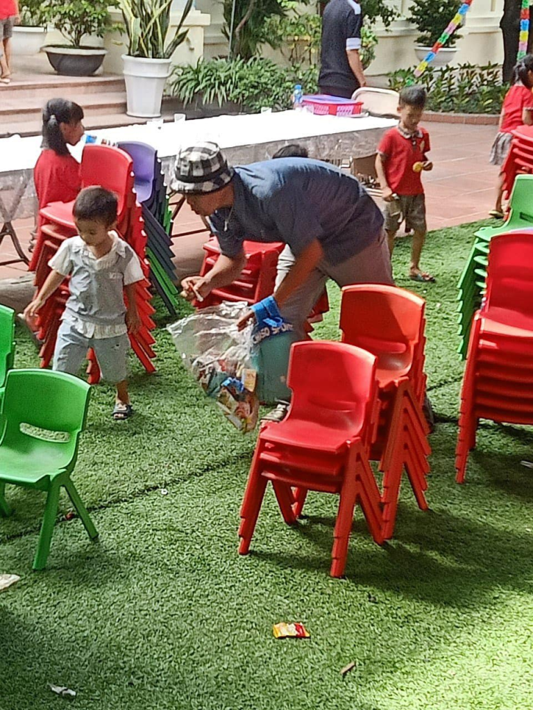 Sau khi buổi lễ tan, các bậc phụ huynh cũng đã ra về vãn, tôi nán lại sau để cùng con chụp kiểu ảnh kỷ niệm ngày đầu tiên con vào trường MN. Tôi cũng thấy một vài phụ huynh cũng như tôi muốn chụp ảnh kỷ niệm, các cô giáo thì bận rộn dọn dẹp bàn ghế; Trong sự khẩn trương đó, đập vào mắt tôi là một phụ huynh đã cùng con của mình đang làm một việc vô cùng ý nghĩa mà chính bản thân tôi cũng cần phải học tập. Anh năm nay chắc khoảng tầm tuổi ngoài 40, ăn mặc giản dị nhưng hành động vô cùng đẹp và đáng trân trọng. Anh đã cùng con đi quanh sân trường nhặt những vỏ kẹo, vỏ sữa, vỏ bim bim mà các bé vừa xả ra sân trường. Nhìn thấy vậy, tôi đã tranh thủ chớp được mấy kiểu ảnh của anh và đồng thời cũng cúi xuống nhặt những vỏ kẹo trước mặt mình và tiến đến cạnh anh ngỏ ý muốn quay lại hình ảnh đẹp của anh nhưng anh đã cười ngại ngùng từ chối và vội vã quay đi không cho tôi chụp ảnh. Lúc đó tất cả các ánh mắt của mọi người ở lại cũng đã hướng về phía anh với vẻ ngưỡng mộ, mọi người không ai bảo ai đều cúi xuống tiếp tục cùng anh nhặt rác trên sân, chỉ sau một loáng sân trường đã sạch trơn. Cô Hiệu trưởng lúc đó cũng lên tiếng “Xin cảm ơn các bậc phụ huynh rất nhiều ạ! Hành động đẹp này sẽ được lan tỏa cho tất cả phụ huynh và đội ngũ của trường để cùng phát huy ở mọi lúc mọi nơi”.
