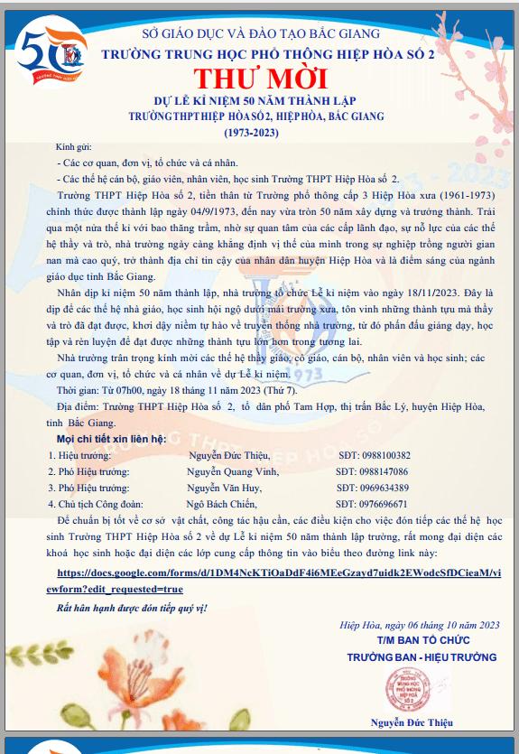 Ban biên tập Hiephoanet.vn đăng toàn văn Thư mời dự Lễ kỷ niệm 50 năm thành lập trường THPT Hiệp Hoà số 2 như sau: