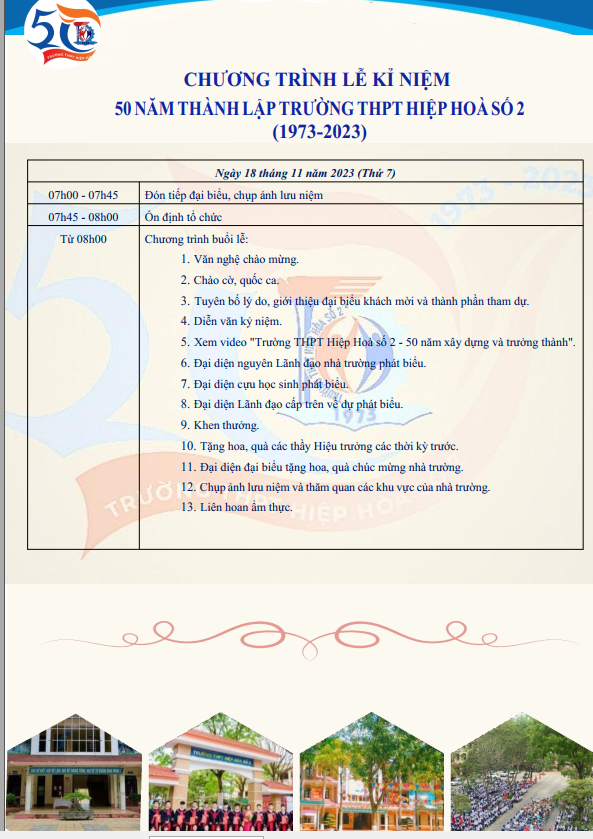 Ban biên tập Hiephoanet.vn đăng toàn văn Thư mời dự Lễ kỷ niệm 50 năm thành lập trường THPT Hiệp Hoà số 2 như sau: Ảnh đầu trang: Đại diện Ban liên lạc Cựu học sinh các khoá của trường THPT Hiệp Hoà số 2 BBT