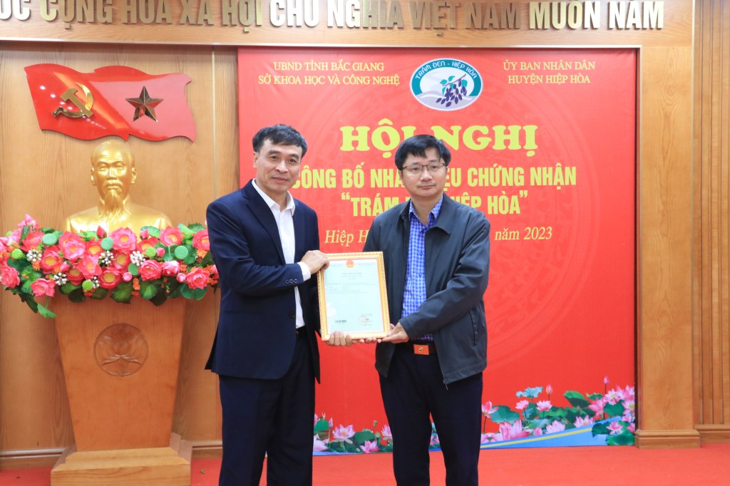 Tại đây, Sở Khoa học và Công nghệ tỉnh Bắc Giang đã trao chứng nhận nhãn hiệu “Trám đen Hiệp Hòa” cho UBND huyện Hiệp Hòa. 20 cá nhân, hộ gia đình sản xuất Trám đen tiêu biểu của huyện cũng được trao giấy chứng nhận Quyền sử dụng nhãn hiệu chứng nhận “Trám đen Hiệp Hòa”.