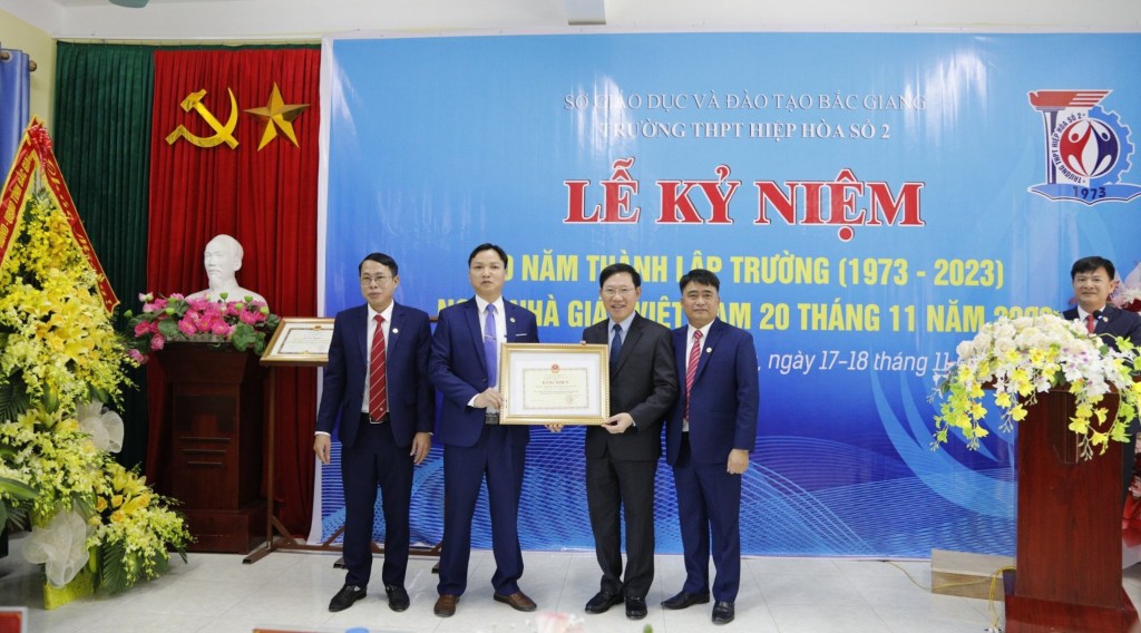 Trước đó ngày 17/11 đồng chí Lê Ánh Dương Phó Bí thư Tỉnh uỷ- Chủ tịch UBND tỉnh Bắc Giang, đồng chí Tạ Việt Hùng Giám đốc Sở Giáo dục và Đào tạol Bí thư Huyện uỷ Ngô Tiến Dũng đã trao Bằng khen của Bộ trưởng Bộ Giáo dục và Đào tạo cho tập thể nhà trường; Trao bằng khen cho 3 tập thể, 5 cá nhân có thành tích xuất sắc, tặng hoa, trao quà của Tỉnh ủy, HĐND, UBND tỉnh và chúc mừng nhà trường.