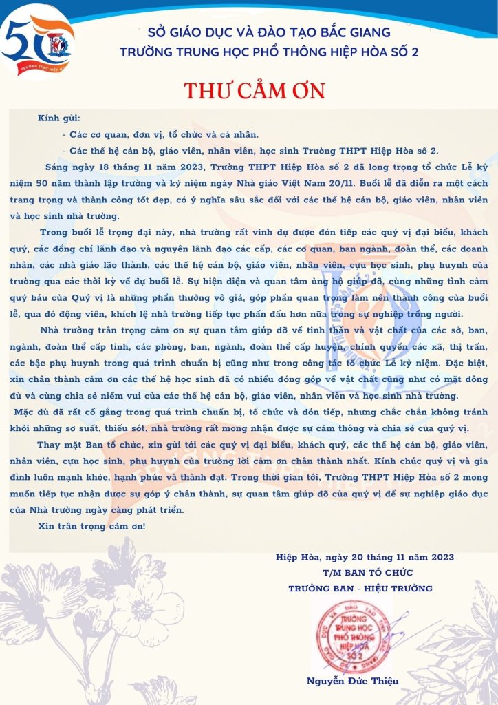 Sau buổi Lễ kỷ niệm 50 năm Ngày thành lập trường 1973-2023 và kỷ niệm Ngày Nhà giáo Việt Nam 20/11/2023. Trường THPT Hiệp Hoà số 2 có thư cảm ơn; BBT Hiephoanet.vn đăng toàn văn thư của nhà trường tới bạn đọc:
