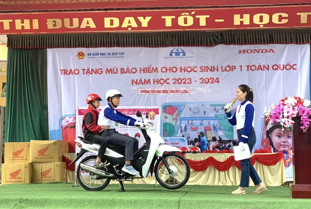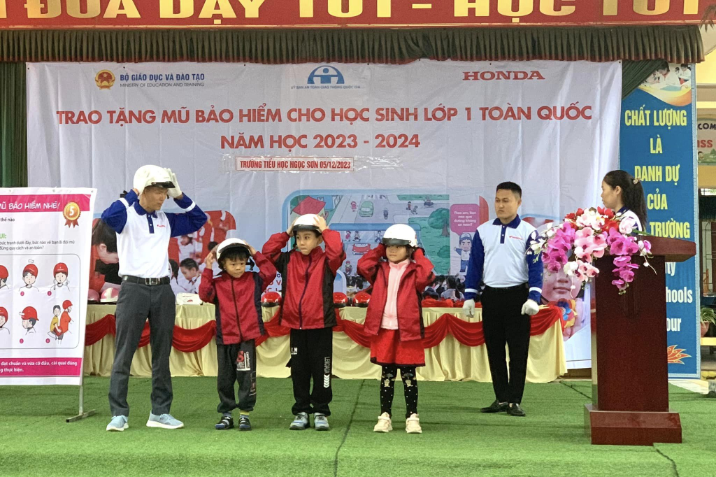 Cuối chương trình, HEAD Honda Đông Ngàn đã tổ chức trao tặng mũ bảo hiểm cho hơn 200 em học sinh lớp 1 của trường.