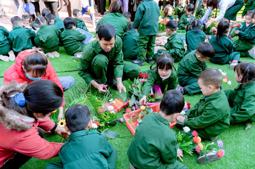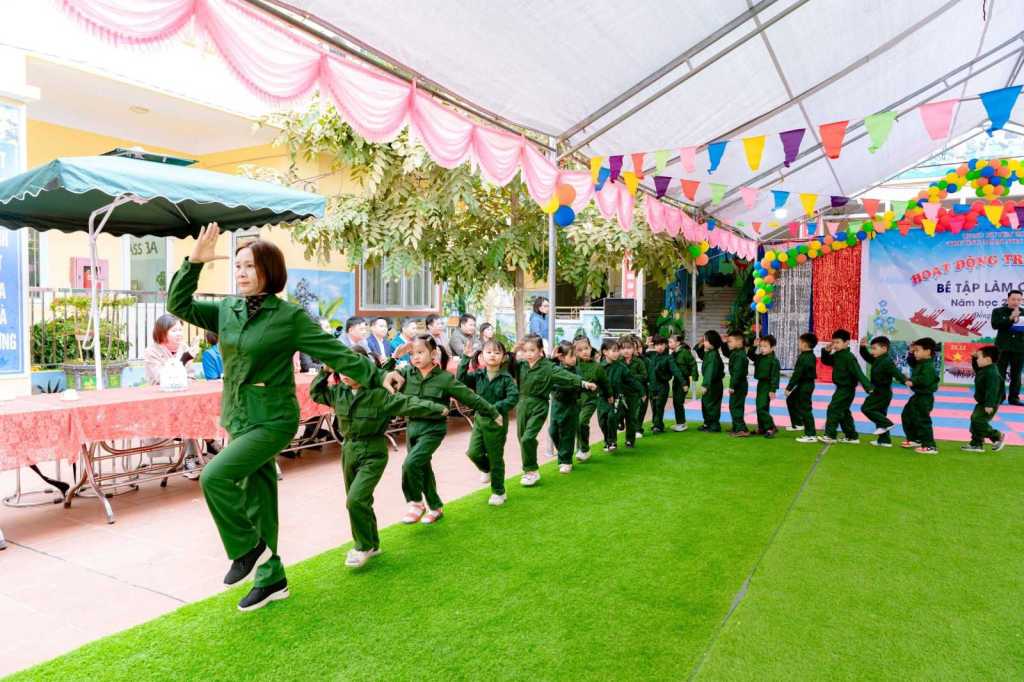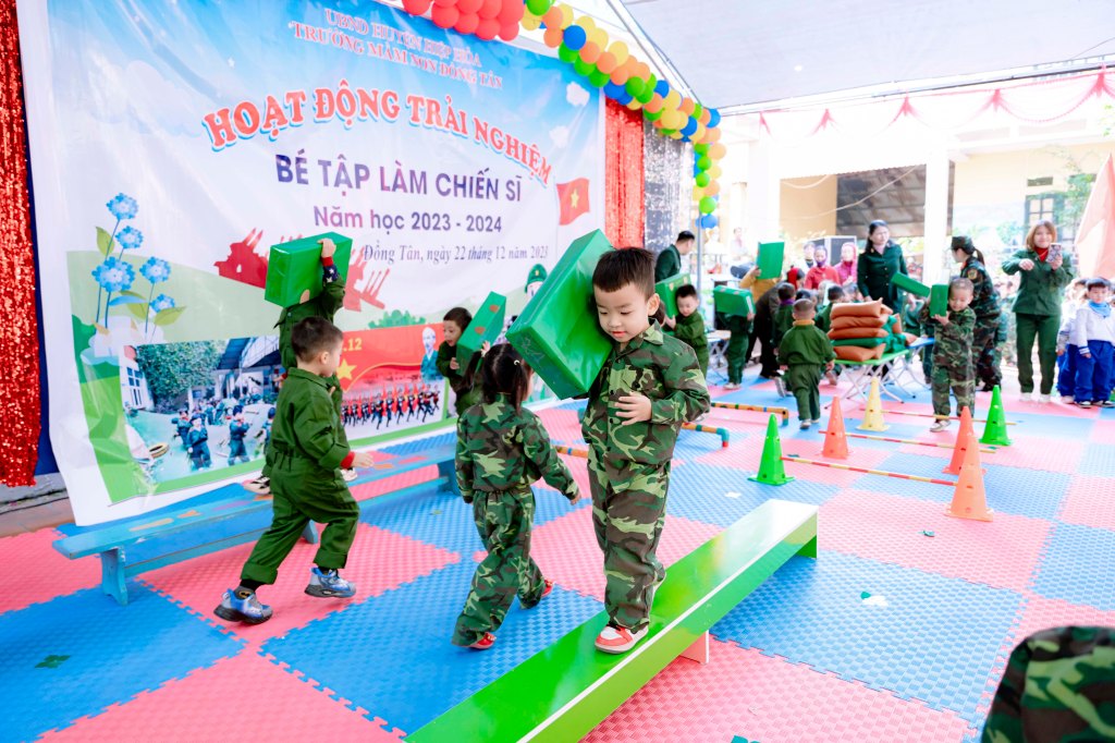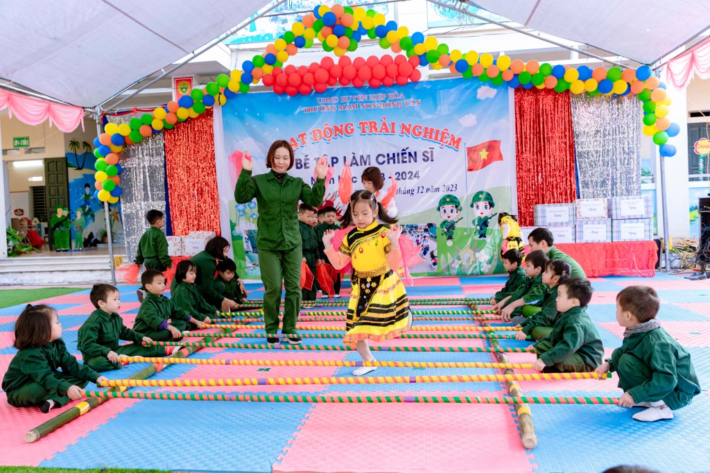 Từ nội dung chủ đề các bài học trên lớp và nhu cầu thực tế, hoạt động trải nghiệm của trẻ em Trường Mầm non Đồng Tân, huyện Hiệp Hòa gồm 3 phần chính nhằm phát huy cao năng lực học sinh và giáo dục truyền thống lực lượng Quân đội anh hùng. Các cô giáo cùng trang phục trong vai các lực lượng Quân đội Nhân dân Việt Nam để hỗ trợ, động viên các nhóm trẻ tham gia hoạt động.